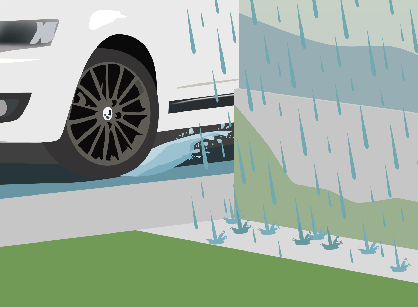 Durch eine zu glatte Oberfläche des Terrains neben der Außenmauer (Betonplatten, Asphaltweg, Traufenpflaster etc.) prallt der Regen ab und spritzt auf den Sockelbereich. Unerwünschte Moosbildung ist z.B. ein Symptom von Spritzwasser.